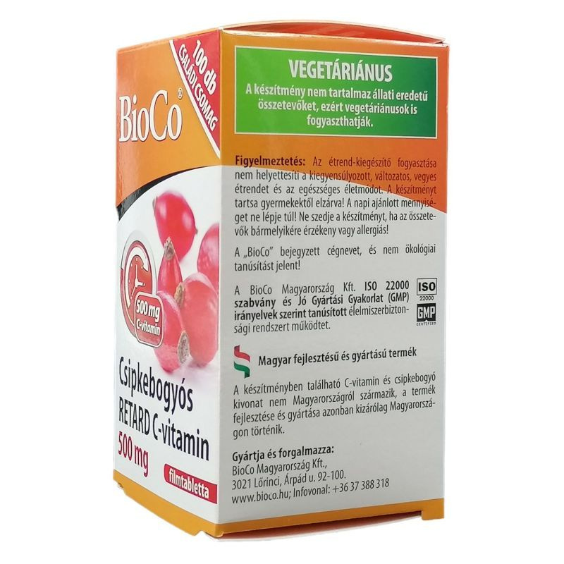 A C-vitamin erős antioxidáns hatású vitamin, nélkülözhetetlen a kollagénfehérje szintézishez, elősegíti a vas bélrendszerből történő felszívódását, az immunrendszer normális működését. Hozzájárul a káros oxidációs folyamatok, ezáltal a sejtek öregedésének gátlásához. A termék fogyasztása ajánlott vitaminhiányos, egyoldalú táplálkozás, dohányzás, kimerültség, általános fáradtság, fokozott C-vitamin szükséglet (terhesség, szoptatás, fogamzásgátló tabletta szedése) esetén, valamint betegség után, az immunrendszer erősítésére. Összetevők: L-aszkorbinsav; tömegnövelő szerek (hidroxi-propil-metil-cellulóz, mikrokristályos cellulóz); csomósodást gátló (magnézium-sztearát); csipkebogyó kivonat (20 mg/tabletta) Alkalmazási javaslat: Naponta 1-2 tablettát bő folyadékkal lenyelni. Nyelési nehézség esetén, a tabletta a felezőnyomat mentén széttörhető. Hatóanyagok: C-vitamin (aszkorbinsav): 500 mg. A termék nem tartalmaz állati eredetű összetevőt, ezért vegetáriánusok is fogyaszthatják. Nettó tömeg: 84 g / 60 db tabletta Minőségét megőrzi: a flakon alján jelzett hónap végéig. Tárolás: A készítményt tartsa gyermekektől elzárva, száraz, hűvös, sötét helyen! A termék kupakját mindig gondosan zárja vissza! Figyelmeztetés: Az étrend-kiegészítő fogyasztása nem helyettesíti a kiegyensúlyozott, változatos, vegyes étrendet és az egészséges életmódot! Az ajánlott napi mennyiséget ne lépje túl!