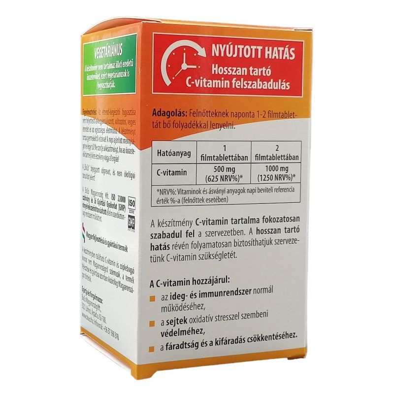 A készítmény C-vitamin tartalma fokozatosan szabadul fel a szervezetben. A hosszan tartó hatás révén folyamatosan biztosíthatjuk szervezetünk C-vitamin szükségletét. Hosszan tartó hatású C-vitamint és csipkebogyó kivonatot tartalmazó étrend-kiegészítő tabletta. A készítmény C-vitamin tartalma fokozatosan szabadul fel a szervezetben. A hosszan tartó hatás révén folyamatosan biztosíthatjuk szervezetünk C-vitamin szükségletét. A csipkebogyó jótékony, immunrendszert támogató hatása - elsősorban természetes C-vitamin tartalmának köszönhetően - régóta közismert.