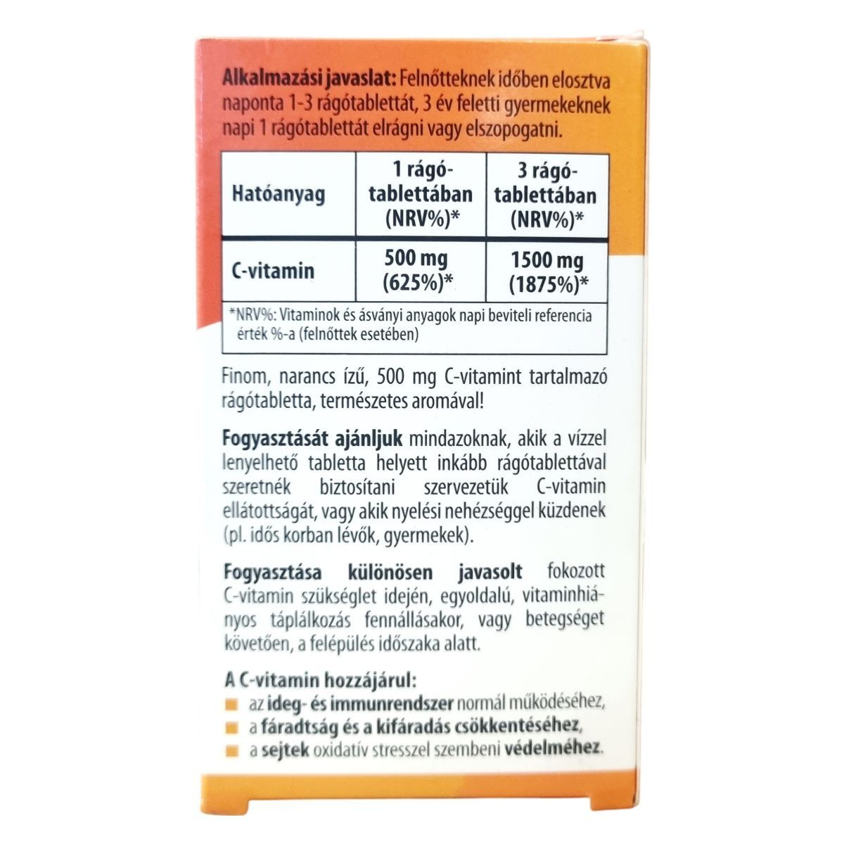 C-vitamin 500 mg rágótablettánként (625% NRV)