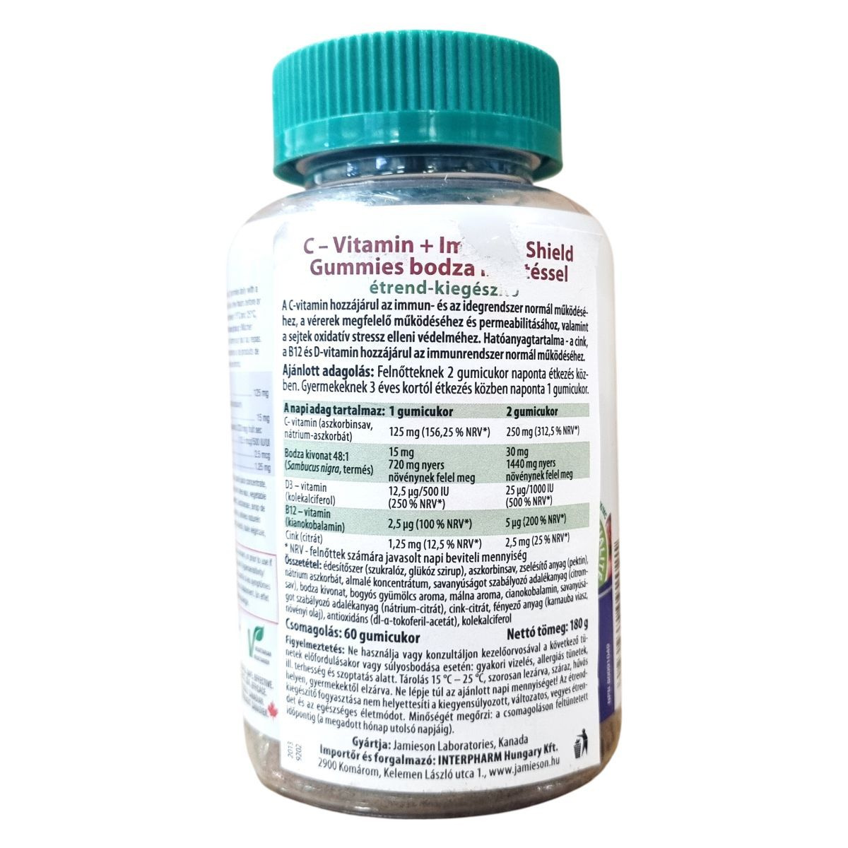 A Jamieson C + immune shield™MC gumicukor természetes bodza ízzel készült, mely hozzájárulhat a megfázás tüneteinek enyhítéséhez és a mindennapi immunrendszeri támogatáshoz. Hatóanyagai között megtalálható a C-vitamin, amely segítheti az immun- és idegrendszer normál működését, támogathatja a vérerek megfelelő működését és védelmet nyújthat a sejtek oxidatív stresszel szemben. A termékben szintén jelen van a bodza kivonat, a D3-vitamin, a B12-vitamin és a cink, melyek együttesen hozzájárulhatnak az immunrendszer megfelelő működéséhez. Minden egyes gumicukor precízen adagolt hatóanyagokat tartalmaz, a fogyasztása kényelmes és ízletes alternatívát kínál. A termék vegetáriánus összetevőket tartalmaz, mesterséges színezék, aroma vagy tartósítószer nélkül készül, és nem tartalmaz glutént, laktózt, valamint gelatinmentes. Használata előtt figyelmet kell fordítani az esetleges allergiás reakciókra, valamint a terhesség és szoptatás időszakára. A csomagolás 60 gumicukrot tartalmaz, amelyeket étkezés közben ajánlott elfogyasztani, a hatóanyagok optimális felszívódása érdekében.