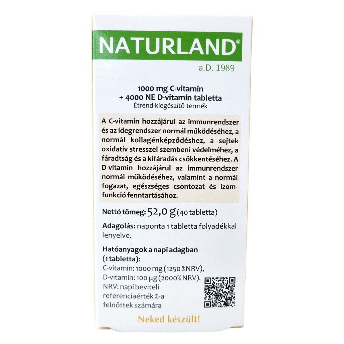A NATURLAND® C + D3 vitamintabletta egy Magyarországon előállított étrend-kiegészítő, amely C- és D-vitamin magas dózisát kínálja egyben. A C-vitamin hozzájárulhat az immunrendszer és az idegrendszer normál működéséhez, a kollagénképződéshez, valamint a sejtek oxidatív stresszel szembeni védelméhez, továbbá a fáradtság csökkentéséhez. A D-vitamin támogatja az immunrendszer működését, az egészséges fogazat, csontozat és izomfunkció fenntartását. A termék gluténmentes és mentes más allergénektől, természetes egészséges összetevőket tartalmaz. A csomagolás 40 tablettát tartalmaz, a nettó tömeg 52,0 g. A termék megvásárlásával magyar munkahelyeket is támogathatunk. Mindig tartsa be az ajánlott adagolást, és konzultáljon orvosával, ha vesekő-betegsége van vagy bizonytalan a készítmény alkalmazását illetően.
