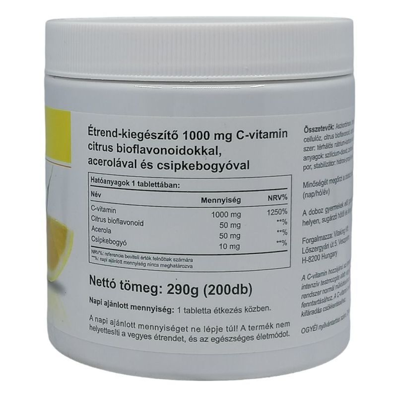 Ezért a téli időszakban semmiképppen nem elhanyagolható a megfelelő mennyiségű C-vitamin fogyasztás. Ha fontos Önnek, hogy minél természetesebb formában pótolja szervezetében a C-vitamint, ez a készítmény megfelelő választás. Az 1000 mg C-vitamin mellett minden tabletta tartalmaz még 50 mg citrus bioflavonoidot, 50 mg acerolát (barbadoszi cseresznye), valamint 10 mg csipkebogyót is. Rengeteg természetes összetevőjének köszönhetően a C-vitamin kiegészítők ezezn formája még hatékonyabban tud hasznosulni a szervezetben. Ezért van Önnek is szüksége C-vitaminra: antioxidáns hatása révén hozzájárul a szervezetben zajló káros oxidatív folyamatok gátlásához, fontos szerepet játszik a szervezet védekező rendszerének működésében, segíti az immunrendszer megfelelő működését, szükséges az idegrendszer normál működéséhez. Hozzájárul a haj, a bőr és a köröm egészségének megőrzéséhez, nélkülözhetetlen az egészséges fogazat, csontozat és íny felépítéséhez. Fontos szerepe van a vas felszívódásában. Elősegíti a szív és a keringési rendszer egészséges működését. Szerepet játszik a vérerek normál struktúrájának fenntartásában. Napi ajánlott mennyiség: 1 tabletta. A felhasználási javaslatban megadott mennyiséget ne lépje túl! A termék nem helyettesíti a vegyes étrendet és az egészséges életmódot. A doboz gyermekek elől gondosan elzárva tartandó!