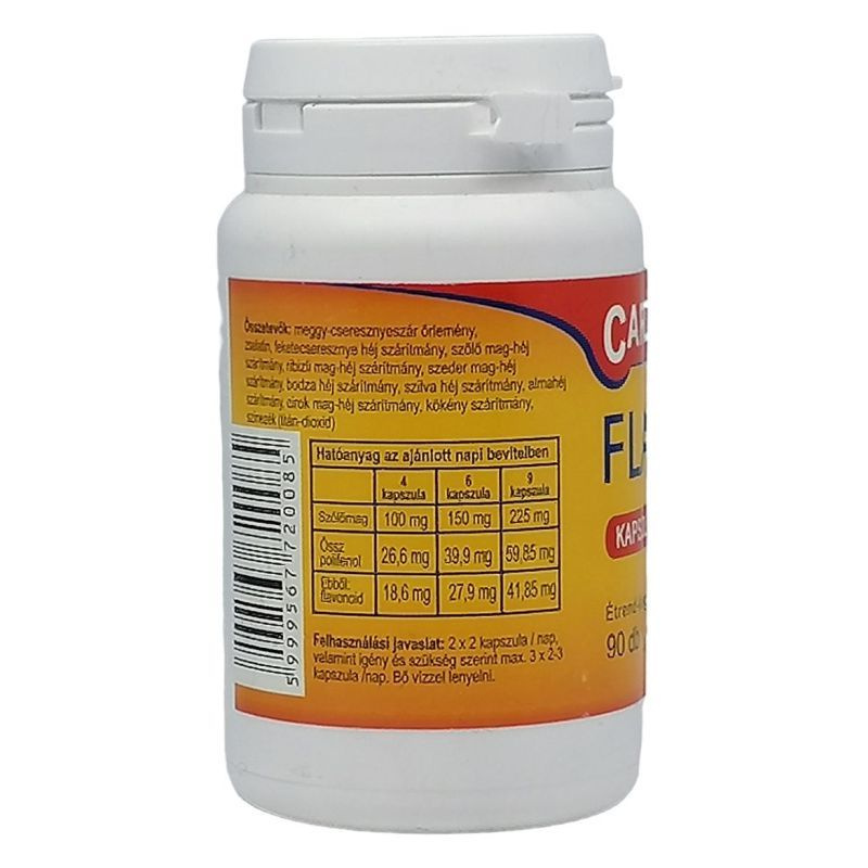 Stressz okozta szív- és érrendszeri betegségeket a flavonoidok rendszeres fogyasztásával megelőzhetjük. A flavonoidok a fotoszintézisre képes növények másodlagos anyagcsere termékei, melyek a polifenol típusú vegyületek csoportjába tartoznak. A kapszula flavonoid tartalma, a FLAVIN7 gyümölcseinek liofilizált koncentrátuma. A flavonoidok főleg az emésztő- és keringési rendszerben hatnak, és bélrendszerben szívódnak fel. A flavonoid típusú vegyületek megkötik a szabadgyököket és antioxidáns hatással rendelkeznek. (Az antioxidánsok olyan stabil molekulák, melyek az instabil oxidánsokhoz kötodnek és semlegesítik azokat. Az oxidánsokat mindig is összefüggésbe hozták a szívbetegséggel és a korai öregedéssel.) A flavonoidok kiváló élettani hatását számos külföldi és hazai klinikai és laboratóriumi vizsgálat igazolja. Mit kell tudni a cseresznye- és meggyszárról? Erősítik a szívműködést, valamint lehetséges infarktust megelőző hatását sem utasíthatjuk el. Hatóanyagai a procianidinek és flavonoidok kétségtelenül szerepet játszanak a főhatás kialakításában. A tudományos álláspont szerint a teljesítménycsökkenés, idős szív, szívtáji nyomó és szorító érzés, ritmuszavarok enyhe formájának kiegészítő kezeléseként jól alkalmazható. Ellenjavallatok nem ismeretesek, de természetesen orvosi kezelésre van szükség, ha a panaszok túlmennek az enyhe zavarokon. Bizonyított, hogy tartós fogyasztása esetén sem kell tartanunk mellékhatástól. Mit kell tudni a Galagonyáról? A Galagonya az a gyógynövény, amelyet a szív oxigénegyensúlyának javításával kapcsolatban, az első helyen kell említeni. Valamelyest erősíti a túlfárasztott szívet, oxigénhez és glukózhoz segíti a szívizomzatot, szabályozza a szívritmust és mindezeken keresztül közvetve nyugtatólag, kiegyensúlyozólag hat. Segít idős és öreg, fáradt, túlterhelt, stresszben élő, túlhajtott szívű embereknek, mert enyhíti az olyan panaszokat mint: teljesítőképesség-csökkenés, szívtáji nyomás és szorító érzés, valamint a szívritmuszavarok egy-egy formája. Megelőzésként, de lezajlott infarktus után is ajánlatos a galagonya fogyasztása. Mit kell tudni a Kökényről? A Kökényt a gyógyászatban a szív- és érrendszeri betegségek kezelésére ajánlják, és használták már az ókorban is. Fanyar termése zsírcsökkentő, anyagcsere fokozó hatása révén enyhe fogyasztó, vizelethajtó, és vesetisztítóként is alkalmazható. A kökénykészítmények tisztítják a vért, és erősítik a szervezetet. A bogyónak jelentős a C vitamin tartalma 60mg/100g, valamint különösen gazdag értékes gyümölcssavakban. Összetevők: Meggy-cseresznyeszár őrlemény, feketecseresznye héj liofilizált őrlemény, szőlő mag-héj liofilizált őrlemény, ribizli mag-héj liofilizált őrlemény, szeder mag-héj liofilizált őrlemény, bodza héj liofilizált őrlemény, szilva héj liofilizált őrlemény, almahéj liofilizált őrlemény, cirok mag-héj őrlemény, kökény liofilizált őrlemény. A kapszula borítása: színezék (titán-dioxid), zselatin. A kapszula széthúzható és a benne lévő tartalom anélkül is elfogyasztható. Felhasználási javaslat:: 2x2 kapszula/nap, valamint igény, és szükség szerint max. 3x2-3 kapszula/nap. Az ajánlott napi mennyiséget ne lépje túl. Étrend-kiegészítő nem helyettesíti a vegyes étrendet és az egészséges életmódot! Tápanyagok az ajánlott napi bevitelben: 1 kapszula : Össz polifenol 10 mg Ebből: flavonoid 7 mg .