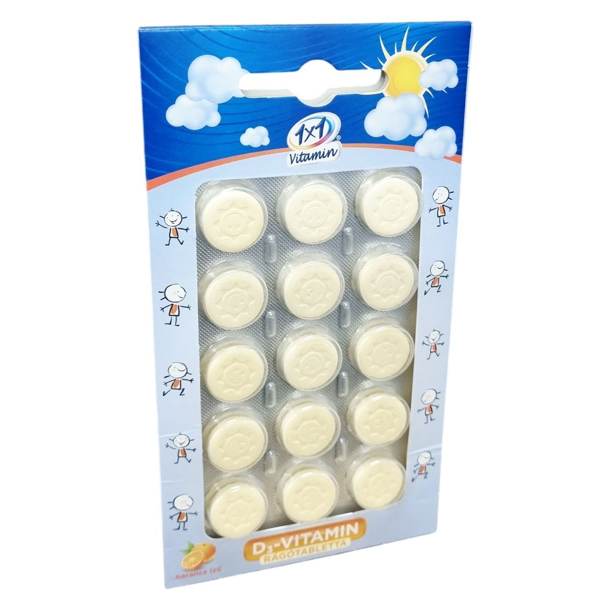Az 1x1 Vitamin D3-vitamin rágótabletta narancs ízű, édesítőszerekkel készült étrend-kiegészítő, amely 15 darab, egyenként 850 mg-os tablettát tartalmaz összesen 12,75 g nettó tömeggel. A készítmény egy tablettában 400 NE (10 µg) D3-vitamint tartalmaz, mely hozzájárulhat az immunrendszer megfelelő működéséhez, valamint támogathatja az egészséges csontozat és fogazat fenntartását. A termék előállítása az Európai Unió területén történik. A gyártási szám a termék azonosítását szolgálja.