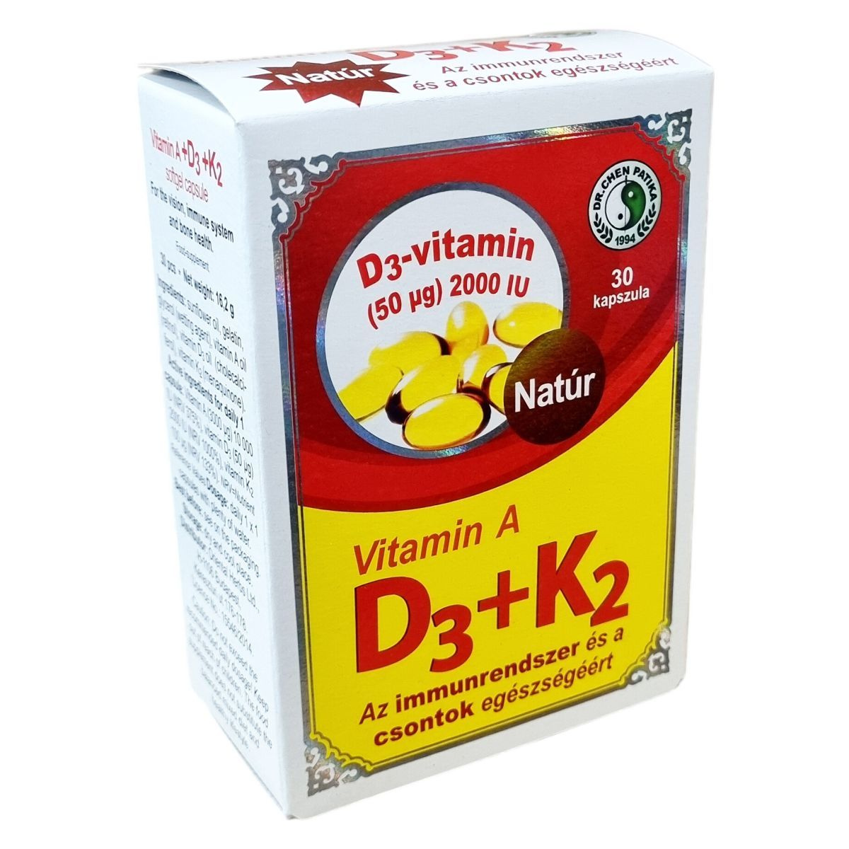 A nagy mennyiségű D3-vitamin az immunrendszer megfelelő működéséhez, valamint a fogazat, a csontrendszer egészségéhez és a normál izomfunkciók fenntartásához járul hozzá. Támogatja a táplálékkal bevitt kalcium és a foszfor hasznosulását a szervezetben. A K2-vitamin termelése a vastagbélben lévő egyes baktériumok által történik; időskorban, illetve antibiotikus kezelés hatására a folyamat csökkenhet. A természetes K2-vitamin részt vesz az egészséges csontrendszer fenntartásában, valamint a normál véralvadási folyamatban. Pótolja a K-vitamint a szervezet számára kedvező természetes forrásból, és támogassa az egészséges életmódot. Az A-vitamin segíti a látás és az immunrendszer normál működését, hozzájárul a nyálkahártya és a bőr megfelelő állapotának fenntartásához.