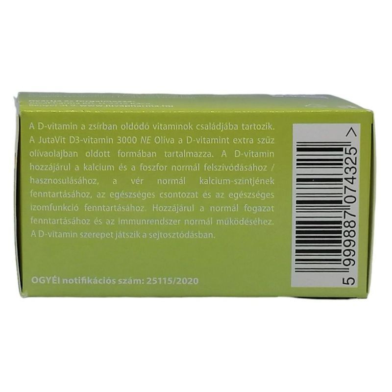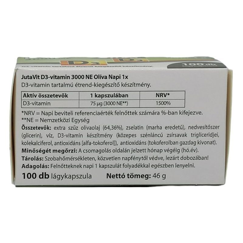 D-vitamin hiányos állapot fennállása esetén, a különleges táplálkozási igény kielégítéséhez igazított összetételű - speciális - gyógyászati célra szánt tápszer. A D-vitamin a zsírban oldódó vitaminok családjába tartozik. A JutaVit D3-vitamin 3000NE Olíva, a D-vitamint extra szűz olívaolajban oldott formában tartalmazza. A D-vitamin hozzájárul a kalcium és a foszfor normál felszívódásához/hasznosulásához. A D-vitamin hozzájárul a vér normál kalciumszintjének, egészséges csontozat és izomfunkció fenntartásához. A D-vitamin szerepet játszik a sejtosztódásban.