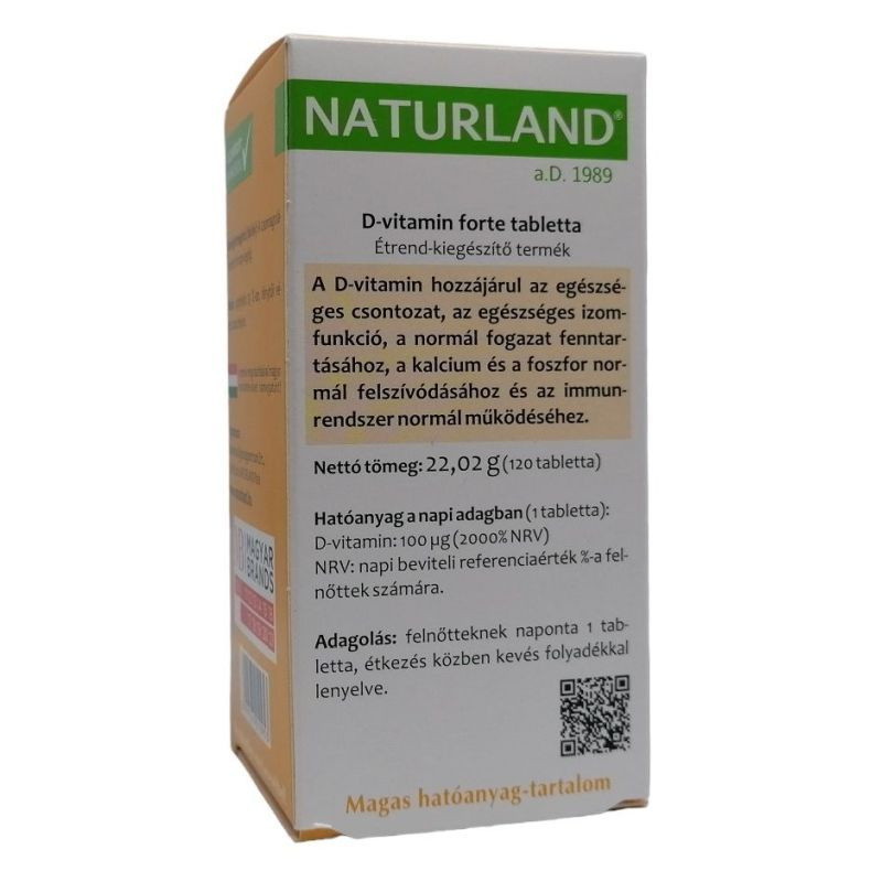 A D-vitamin hozzájárul a kalcium és a foszfor normál felszívódásához és az immunrendszer normál működéséhez. Nettó tömeg: 22,02 g (120 x 183,5 mg tabletta). Minőségét megőrzi: a csomagoláson jelzett hónap végéig (hónap, év). Tárolás: legfeljebb 25 °C-on, fénytől védett, száraz helyen, gyermekek elől elzárva. Adagolás: naponta 1 db tabletta, étkezés közben kevés folyadékkal lenyelve.