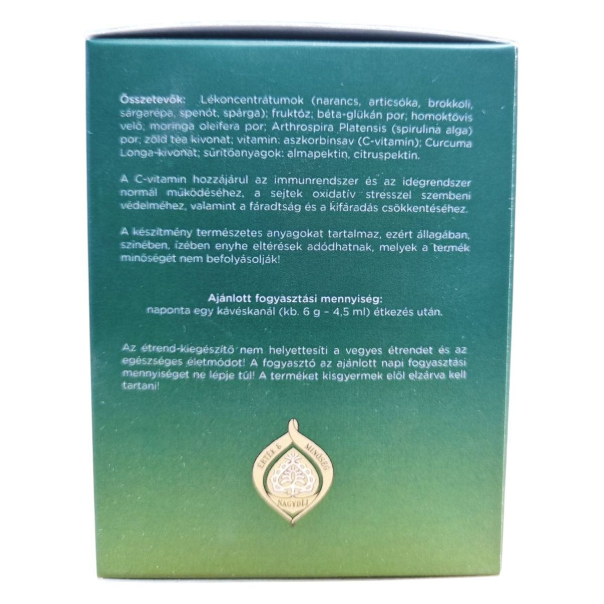 Az étrend-kiegészítő nem helyettesíti a vegyes étrendet és az egészséges életmódot! A fogyasztó az ajánlott napi fogyasztási mennyiséget ne lépje túl! A terméket kisgyermek elől elzárva kell tartani!