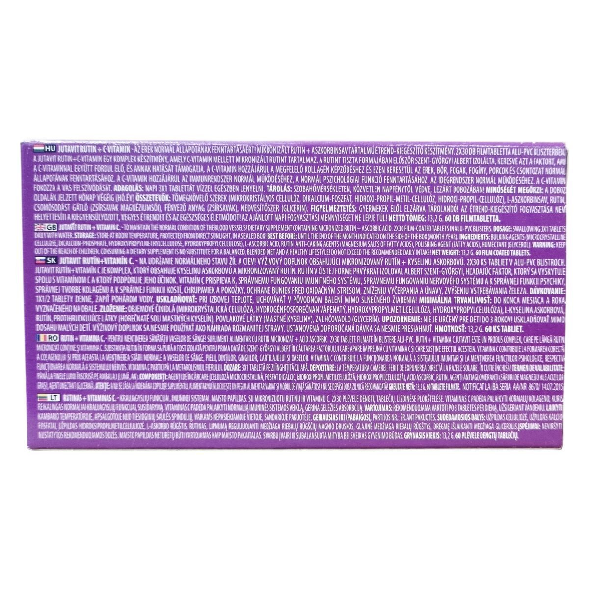 A JutaVit Rutin+Vitamin C egy komplex étrend-kiegészítő, amely mikronizált rutint és C-vitamint tartalmaz. A rutin tiszta formában Szent-Györgyi Albert által került izolálásra, aki annak hatását a C-vitaminnal együtt vizsgálta. A C-vitamin hozzájárulhat a megfelelő kollagénképződéshez, ezen keresztül az erek, a bőr, a fogak, a fogíny, a porcok és a csontozat normál állapotának fenntartásához. Támogathatja az immunrendszer normál működését, a normál pszichológiai funkciók fenntartását és az idegrendszer normál működését. Emellett elősegítheti a vas felszívódását. Az adagolás napi három tabletta, melyet vízzel kell lenyelni. A terméket szobahőmérsékleten, fénytől védve és zárt dobozban javasolt tárolni. A termék csomagolása 2x30 darabos alu-pvc bliszterekben található. Az összetevők között szerepelnek tömegnövelő szerek, L-aszkorbinsav, rutin, csomósodást gátló anyagok, fényező anyag és nedvesítőszer. A termék fogyasztása nem helyettesíti a kiegyensúlyozott étrendet és az egészséges életmódot. Gyermekektől elzárva kell tartani, és az ajánlott napi adagot nem szabad túllépni.