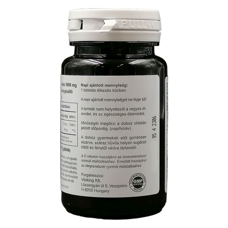 Antioxidáns hatása révén hozzájárul a szervezetben zajló káros oxidatív folyamatok gátlásához, fontos szerepet játszik a szervezet védekező rendszerének működésében, segíti az immunrendszer megfelelő működését, szükséges az idegrendszer normál működéséhez, hozzájárul a haj, a bőr és a köröm egészségének megőrzéséhez, nélkülözhetetlen az egészséges fogazat, csontozat és íny felépítéséhez, fontos szerepe van a vas felszívódásában, elősegíti a szív és a keringési rendszer egészséges működését, szerepet játszik a vérerek normál struktúrájának fenntartásában. A hivatalos álláspont szerint egészséges ember napi C-vitamin szükségletét a helyesen összeállított és jó konyhatechnikával elkészített ételekkel még a tél végi és tavaszi hónapokban is fedezni lehet. Napi ajánlott mennyiség 1 kapszula. A felhasználási javaslatban megadott mennyiséget ne lépje túl! Hatóanyagok - 1 db kapszulában: C-vitamin (aszkorbinsav) 1000 mg, csipkebogyó 60 mg.