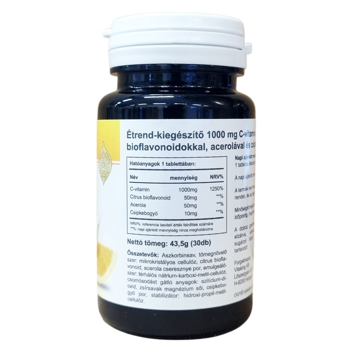 Az étrend-kiegészítő egy tablettánként 1000 mg C-vitamint tartalmaz bioflavonoidokkal, acerolával és csipkebogyóval. Az összetevők között megtalálható az aszkorbinsav, tömegnövelő szerként mikrokristályos cellulóz, valamint emulgeálószerként térhálós nátrium-karboxi-metil-cellulóz. A csomósodást gátló anyagok a szilícium-dioxid és a zsírsavak magnézium sói, stabilizátorként pedig hidroxi-propil-metil-cellulóz szolgál. A termék nettó tömege 43,5 g és 30 tablettát tartalmaz. A Vitaking Kft. forgalmazza a terméket, melynek OGYÉI engedély száma 20374/2018. A doboz oldalsó részén feltüntetett időpontig megőrzi minőségét.