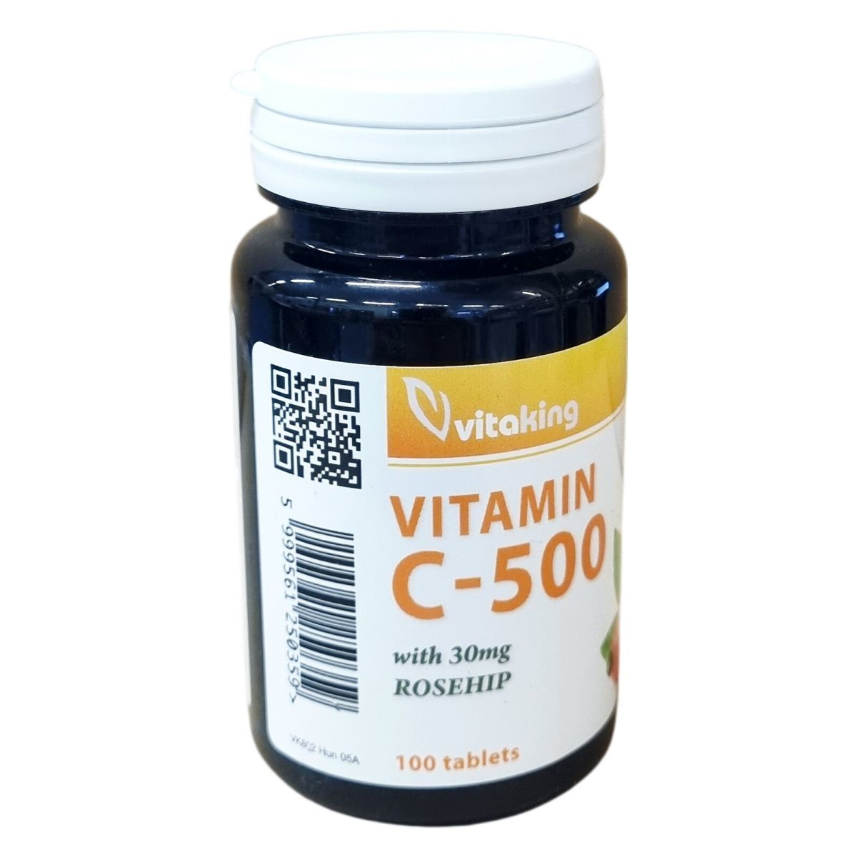 A Vitaking Vitamin C-500 étrend-kiegészítő tablettánként 500 mg C-vitamint és 30 mg csipkebogyót tartalmaz. A C-vitamin hozzájárulhat az immunrendszer normál működéséhez. A készítmény összetevői között aszkorbinsav, mikrokristályos cellulóz, hidroxi-propil-metil-cellulóz, zsírsavak, szilícium-dioxid, zsírsavak magnézium sói és csipkebogyó találhatók. A termék nem helyettesíti a vegyes étrendet és az egészséges életmódot. Ajánlott az 1 tabletta fogyasztása étkezés közben, és fontos, hogy a napi ajánlott mennyiséget ne lépjük túl. Az étrend-kiegészítőt gyermekektől elzárva, száraz, hűvös helyen, sugárzó hőtől és fénytől védve kell tárolni. A minőségmegőrzési időpont a doboz oldalán található.
