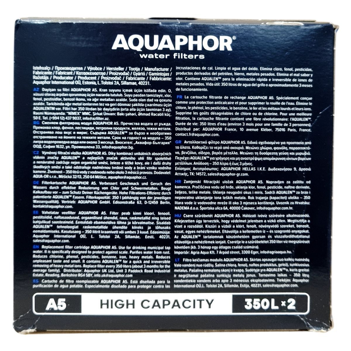 Az AQUAPHOR A5 szűrőbetét egy magas kapacitású, fejlett technológiát alkalmazó vízszűrő, amely segít csökkenteni a klór, peszticidek, fenolok, nehézfémek és egyéb káros anyagok jelenlétét a csapvízben. A szűrő előszűrő rétege megszűri az ülepedő anyagokat, mint például a homok és rozsda, míg az egyedi AQUALEN™ mikroszálas réteg jelentősen megnöveli a szűrés hatékonyságát az ioncserélő gyanta és aktív szén kombinációjával. Az AQUALEN™ különösen nagy, 33-szoros szorbens felülettel rendelkezik, amely visszafordíthatatlanul köti meg a nehézfém ionokat, így a szűrő hatékony bármely vízkeménység esetén. A szűrő hosszú élettartamú, akár 350 liter megtisztított vizet vagy mintegy három hónap használatot biztosít, ezzel hozzájárulva a műanyag hulladék csökkentéséhez és költségmegtakarításhoz is.