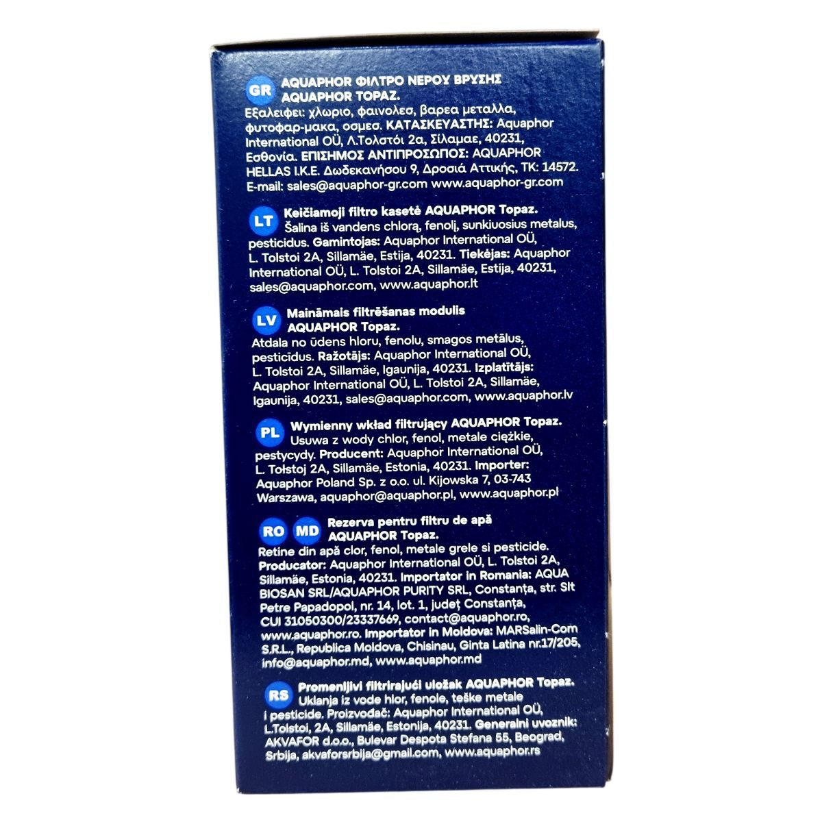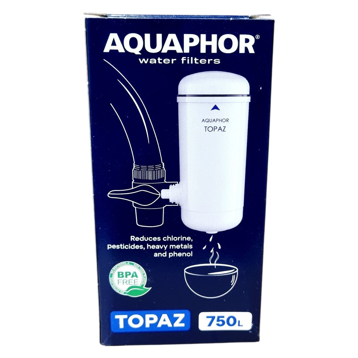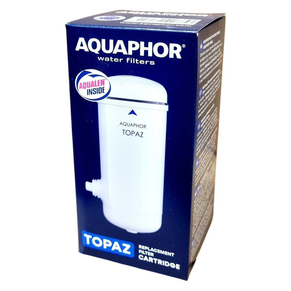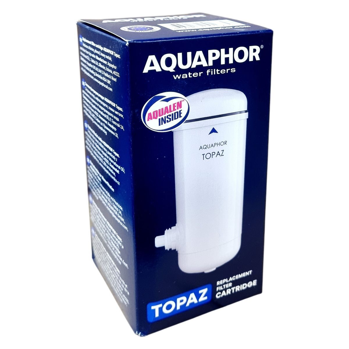 Az AQUAPHOR TOPAZ vízszűrő cserepatron 750 liter kapacitással rendelkezik, BPA-mentes anyagokból készült. A termék segít csökkenteni a csapvízben előforduló káros szennyeződések, például klór, peszticidek, fenolok és nehézfémek mennyiségét, ezáltal biztonságosabb és tisztább ivóvizet biztosít. A szűrőben található AQUALEN™ szűrőanyag hatékonyan működik a víz tisztításában. A patron több országban forgalmazott és mindenhol az Aquaphor nemzetközi leányvállalatai forgalmazzák, melyek a helyi szabályozásoknak megfelelően biztosítják a termék kiszolgálását. A termék használata során javasolt a helyi környezetvédelmi előírások betartása a hulladék ártalmatlanításakor.